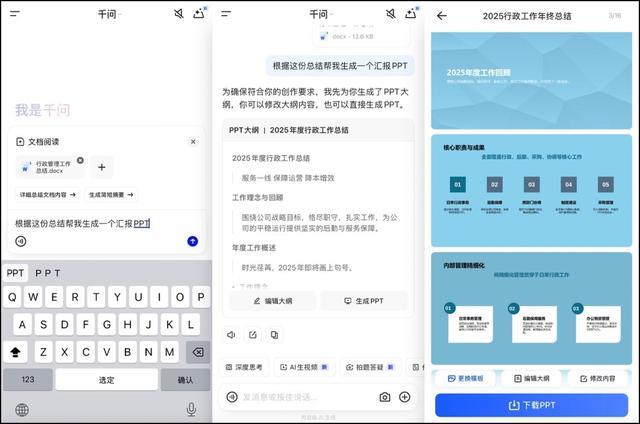 IT之家 12 月 4 日消息,今日,阿里千问宣布将文档生成、智能排版、在线编辑、多格式转换等整合为一站式操作。同时,全新的 PPT 生成能力上线,千问可基于图片、文档、语音等多种输入内容精准提炼、智能匹配模版。目前,上述能力向所有用户免费开放。