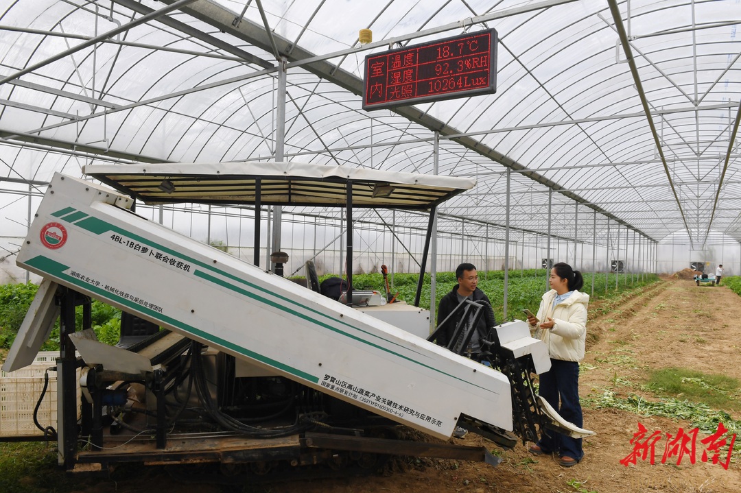 湖南日报12月4日讯(全媒体记者 胡盼盼)记者今天在浏阳市沙市镇沙市村的蔬菜大棚里看到,湖南农业大学自主研发的白萝卜收获机在地里走一圈,就把满地白萝卜收干净了。湖南农业大学机电工程学院教授刘大为称,这是我国首台适合南方地区作业的白萝卜收获机。